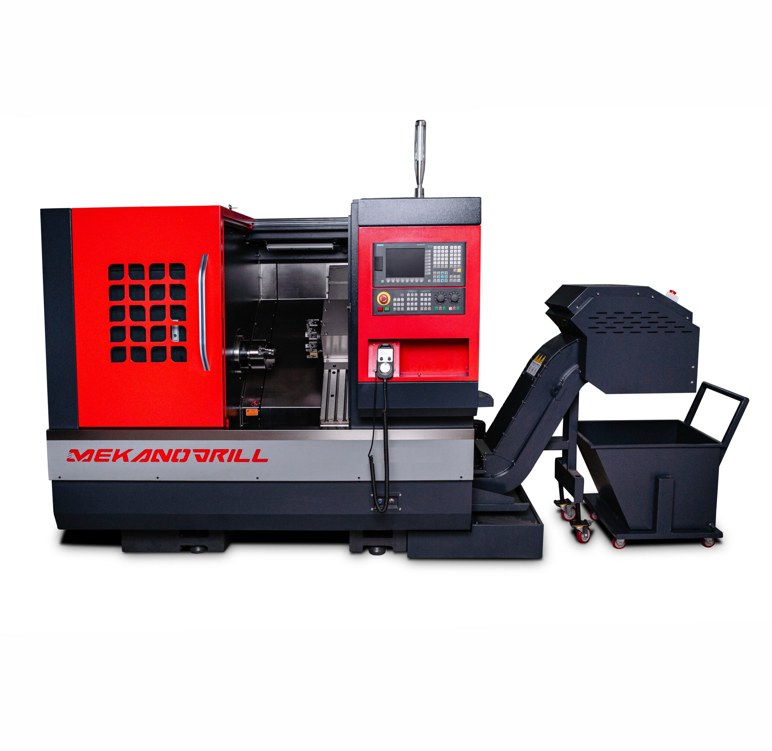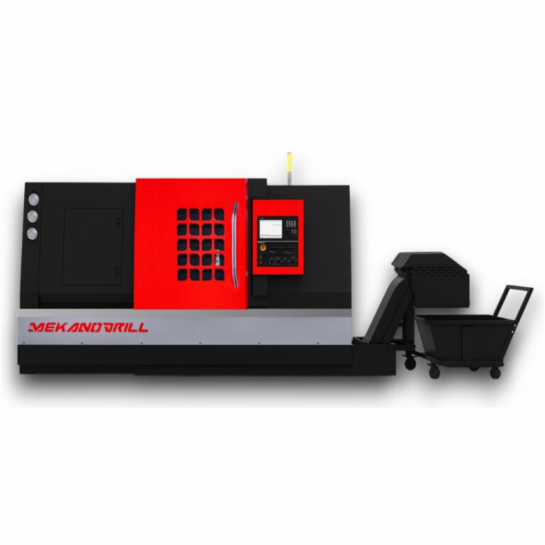 O spindle com nariz A2-4 usa placa hidráulica de 5”, trabalha a até 6000 rpm e potência de 3,7/5,5 kW, além de furo de 46 mm e passagem de barra de até 35 mm, facilitando a usinagem em barra. Nos eixos, conta com guias lineares 25/25 e fusos 25/25, com precisão de 0,005 mm e repetibilidade de 0,003 mm, mantendo a precisão dimensional ao longo do lote. Compacto e estável, possui 1900 x 1800 x 1850 mm e 2100 kg, sendo uma opção eficiente para produtividade com bom aproveitamento de espaço.
